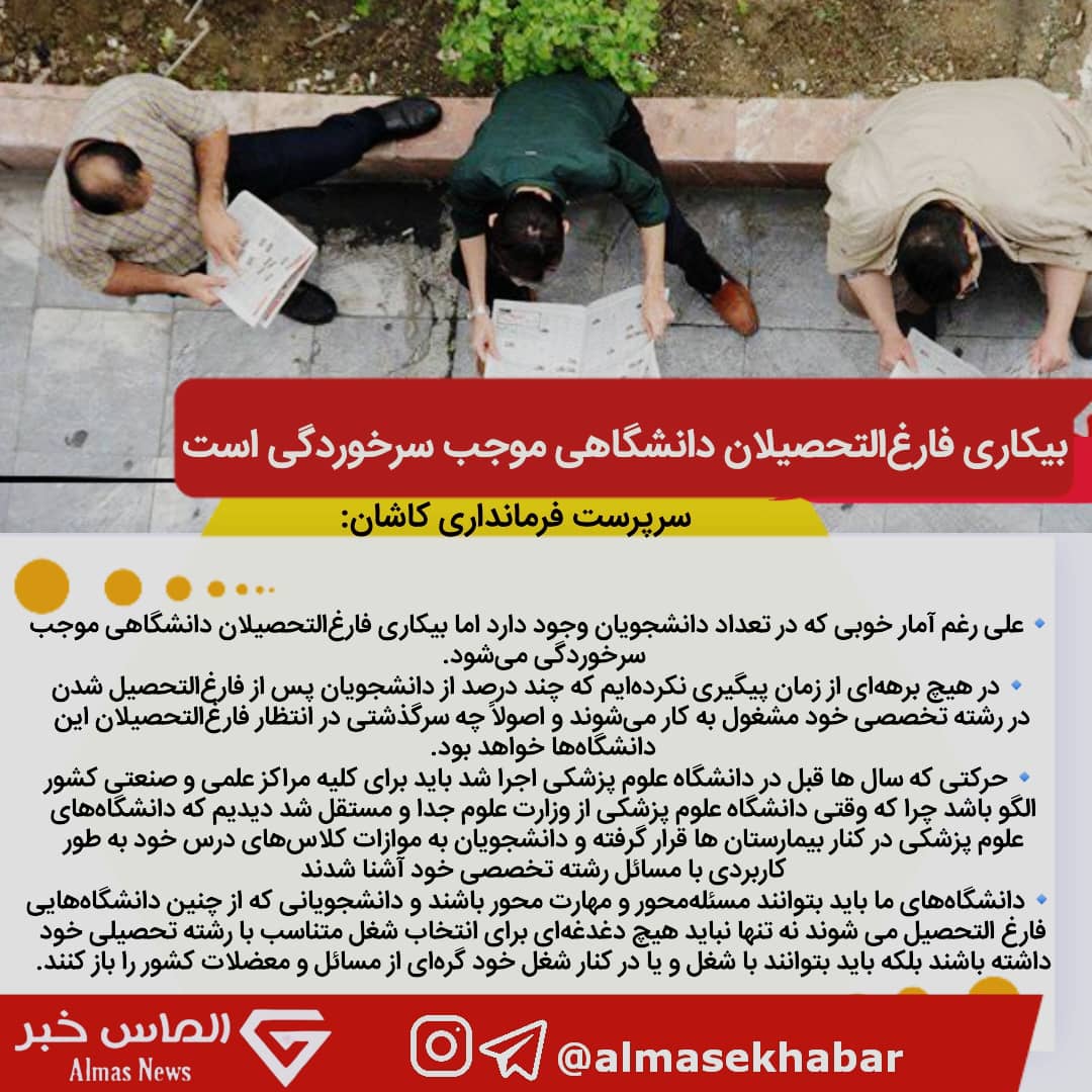 سرپرست فرمانداری کاشان گفت: علی رغم آمار خوبی که در تعداد دانشجویان وجود دارد اما بیکاری فارغ التحصیلان دانشگاهی موجب سرخوردگی می شود.