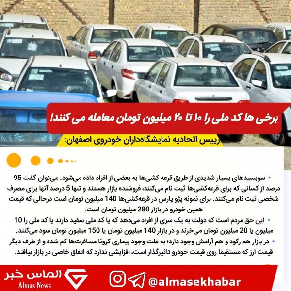 رئیس اتحادیه نمایشگاه داران خودروی اصفهان گفت: سوبسیدهای بسیار شدیدی از طریق قرعه کشی ها به بعضی از افراد داده می شود می توان گفت ٩۵ درصد از کسانی که برای قرعه کشی ثبت نام می کنند فروشنده بازار هستند و تنها ۵ درصد از آنها برای مصرف شخصی ثبت نام می کنند.