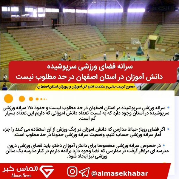 معاون تربیت بدنی و سلامت اداره کل آموزش و پرورش استان اصفهان گفت: سرانه ورزشی سرپوشیده در استان اصفهان در حد مطلوب نیست و حدود ١٧٠ سرانه ورزشی سرپوشیده در استان وجود دارد که به نسبت تعداد دانش آموزانی که داریم این تعداد بسیار کم است.