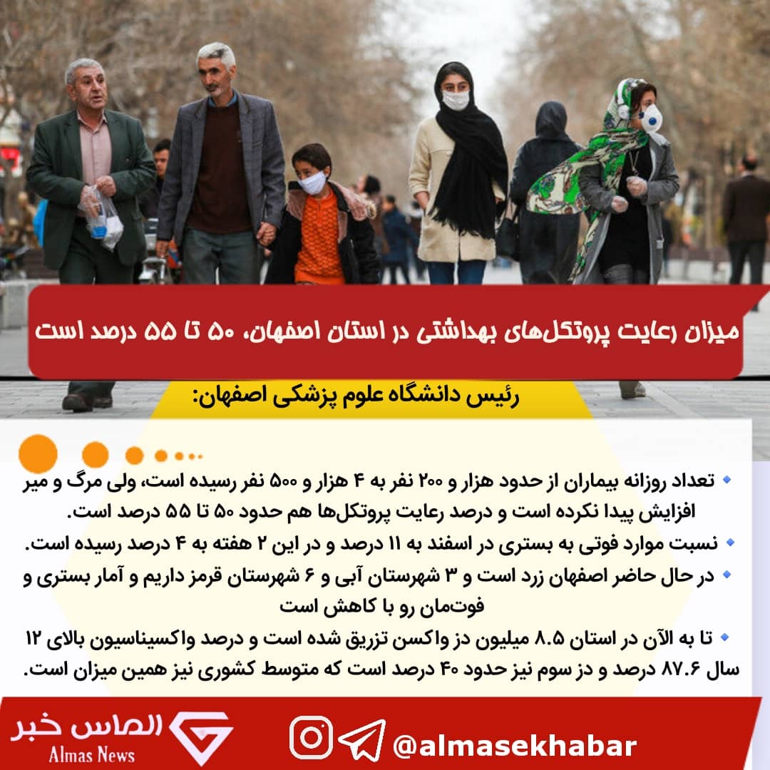 عکس نوشت| میزان رعایت پروتکلهای بهداشتی در استان اصفهان ۵۰ تا ۵۵ درصد است
