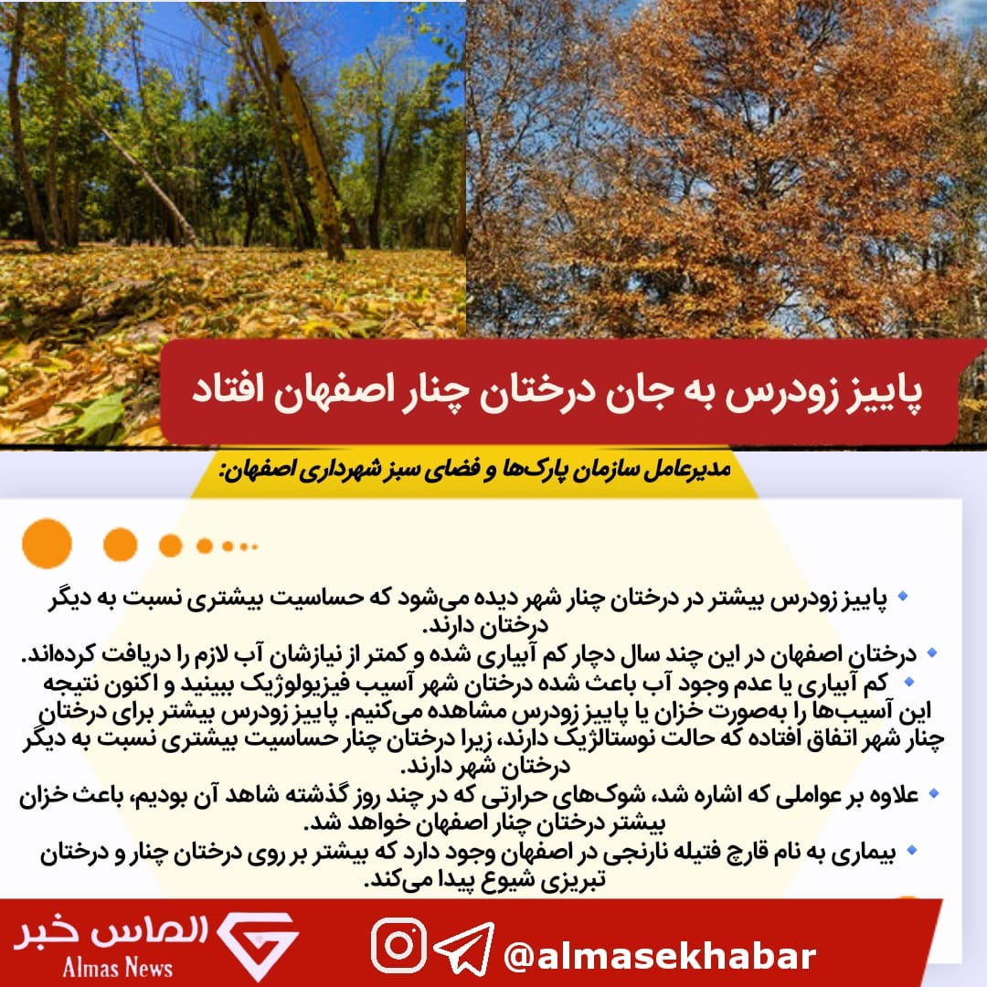 مدیرعامل سازمان پارکها و فضای سبز شهرداری اصفهان گفت: پاییز زودرس بیشتر در درختان چنار شهر دیده میشود که حساسیت بیشتری نسبت به دیگر درختان دارند.