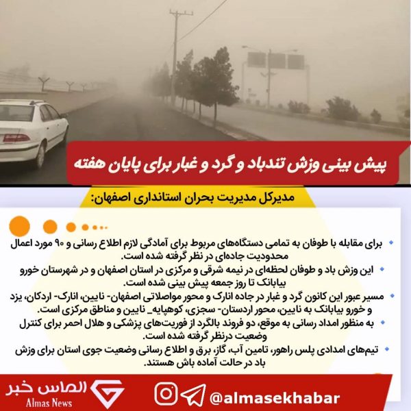 مدیر کل مدیریت بحران استانداری اصفهان گفت: برای مقابله با طوفان به تمامی دستگاه‌های مربوط برای آمادگی لازم اطلاع رسانی و ۹۰ مورد اعمال محدودیت جاده‌ای در نظر گرفته شده است.