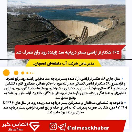 مدیر عامل شرکت آب منطقه‌ای اصفهان گفت: سال جاری ۸۶ هکتار از اراضی آزاد شده بستر دریاچه سد مخزنی زاینده رود، رفع تصرف و آزادسازی ۶۸ هکتار از اراضی تملیکی سد زاینده‌رود با حکم قضائی، همکاری لازم و تشکیل جلسه‌های آگاه سازی، فرهنگ سازی با دهیاری و شوراهای روستاها، نمایندگان بهره برداران و کشاورزان و هماهنگی با دادستان و فرماندار شهرستان چادگان، خلع ید، آزاد سازی و اعاده به وضع سابق شد.