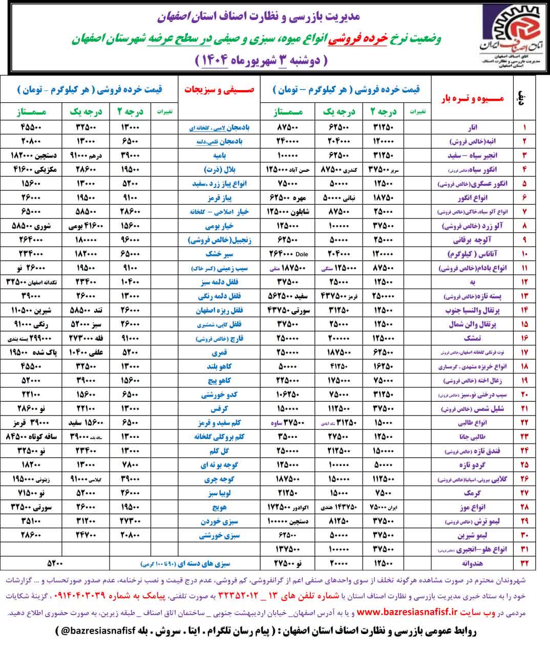 – پیاز سفید از ۵ هزار تا ۱۵ هزار تومان، سیب‌زمینی از ۹ هزار تا ۲۶ هزار تومان همچنین هویج از ۱۹ تا ۲۶ هزارتومان و هویج ممتاز ۳۲ هزار تومان، کاهوپیچ ۱۵ تا ۵۲ هزار تومان و کدو خورشتی ۶ هزار تا ۲۲ هزار تومان در بازار عرضه می‌شود.