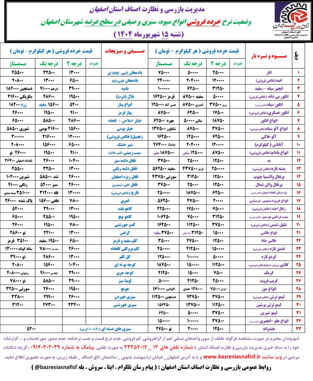 سیب از ۳۱ هزار تا ۱۰۶ هزار تومان، هندوانه از ۱۲ هزار تا ۲۷ هزار تومان قیمت خورده و همچنین انواع هلو (انجیری) از ۳۷ هزار تا ۱۵۰ هزارتومان، لیمو شیرین از ۳۷ هزار تا ۶۲ هزار تومان به فروش می رسد.