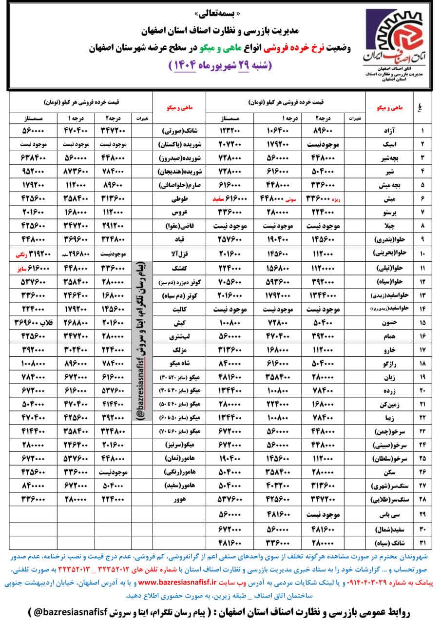 ماهی قزل‌آلا سفید ۲۹۶ هزارتومان، ماهی قزل‌آلا ممتاز رنگی کیلویی ۳۱۹هزار تومان، ماهی آزاد از ۸۹ تا ۱۰۶ هزار و ماهی آزاد ممتاز ۱۲۳ هزارتومان، ماهی سرخو سلطانی از ۱۱۲ تا ۱۹۰ هزار تومان و ماهی خارو از ۱۱۲ تا ۳۱۳ هزار تومان در دسترس مشتریان قرار دارد.