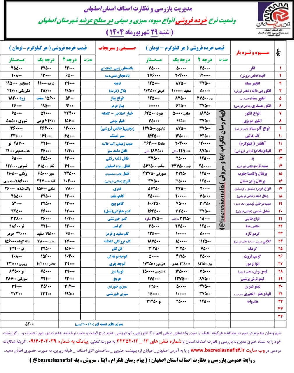 انواع پیاز از ۵ هزار تا ۱۸ هزار تومان، سیب‌زمینی از۱۳ هزار تا ۲۸ هزار تومان همچنین هویج از ۱۳ تا ۲۲ هزارتومان و هویج ممتاز ۲۸ هزار تومان، کاهوپیچ ۱۳ تا ۵۲ هزار تومان و کدو خورشتی ۱۰ هزار تا ۳۳ هزار تومان در بازار عرضه می‌شود.