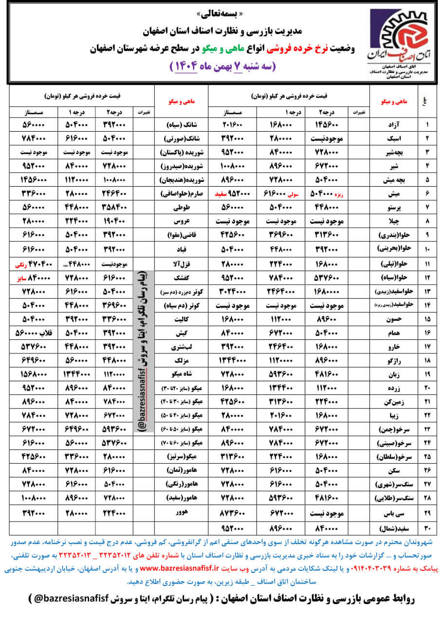 ماهی قزل آلا سفید ۴۴۸ هزار تومان، ماهی قزل‌آلا ممتاز رنگی کیلویی ۴۷۰ هزارتومان، ماهی آزاد از ۱۴۵ تا ۱۶۸ هزار و ماهی آزاد ممتاز ۲۰۰ هزار تومان، ماهی سرخو سلطانی از ۱۶۸ تا ۳۱۳ هزار تومان و ماهی خارو از ۱۶۸ تا ۳۹۲ هزارتومان در دسترس مشتریان قرار دارد.