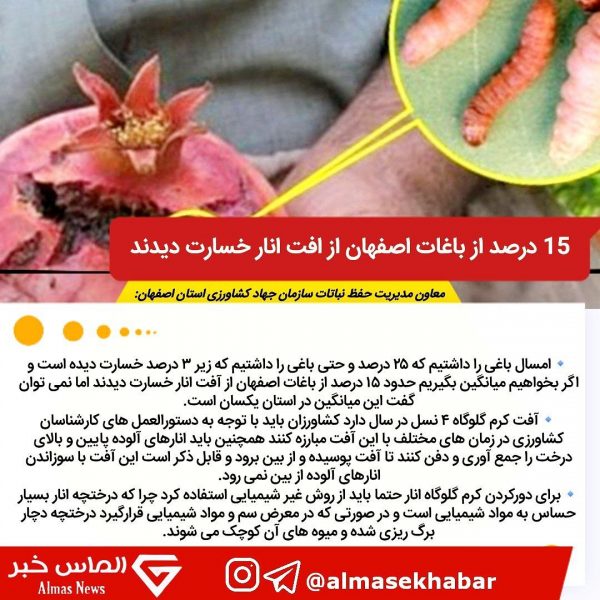 معاون مدیریت حفظ نباتات سازمان جهاد کشاورزی استان اصفهان گفت: امسال باغی را داشتیم که ٢۵ درصد و حتی باغی را داشتیم که زیر ٣ درصد خسارت دیده است و اگر بخواهیم میانگین بگیریم حدود ١۵ درصد از باغات اصفهان از افت انار خسارت دیدند.